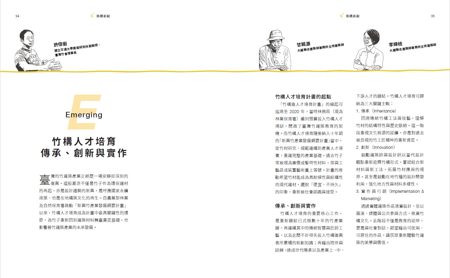 「本書收錄的案例,呈現臺灣近年來在文化傳承、科學驗證與建築創新上的集體實踐,描繪出臺灣竹構的當代風景,也擴展建築、藝術與教育的想像,使竹構邁向可居、可用、可延續的生活建築。」